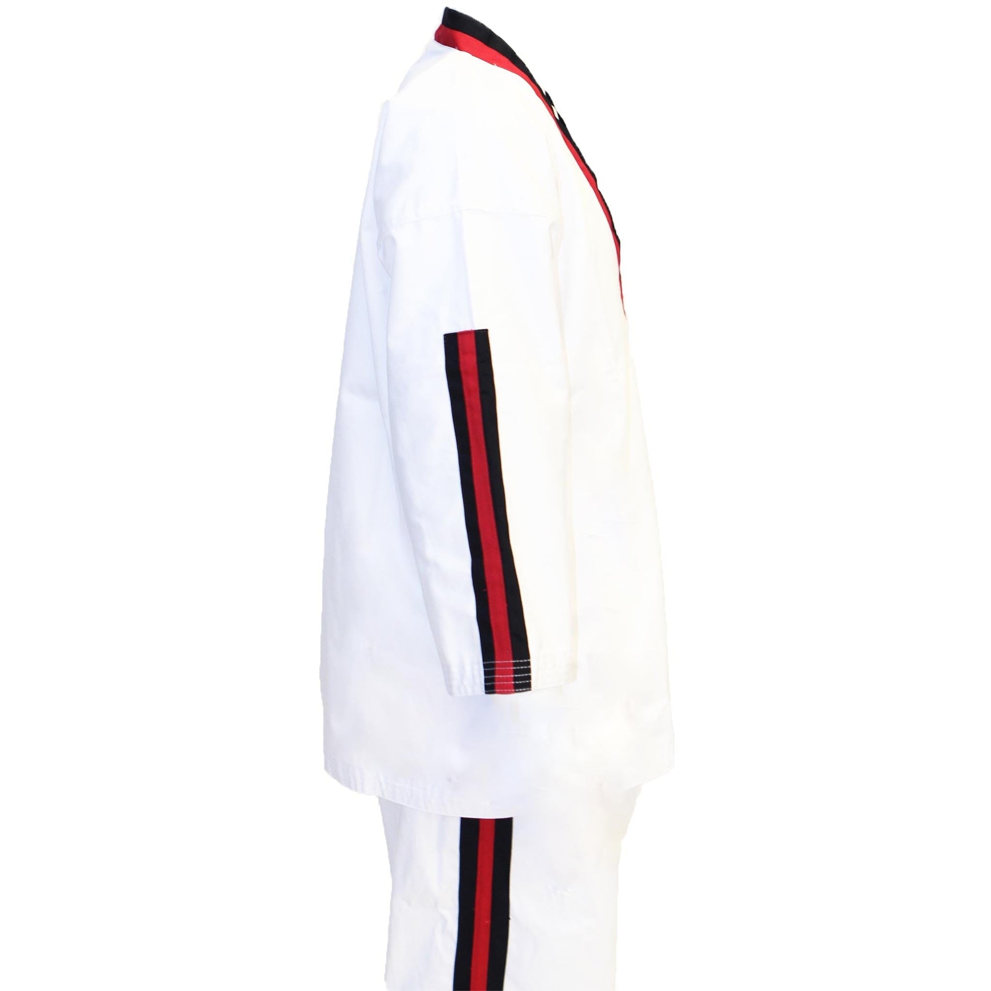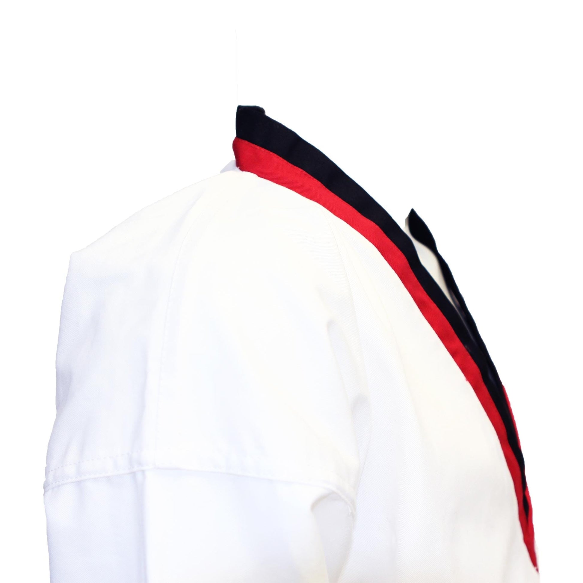 Featuring a sleek twill weave, our uniforms are wash and wear, ensuring minimal shrinkage and maximum longevity. The classic white color is accentuated with striking Black & Red striped detailing on the neck, sleeves, and pants, adding a touch of style to your performance.
